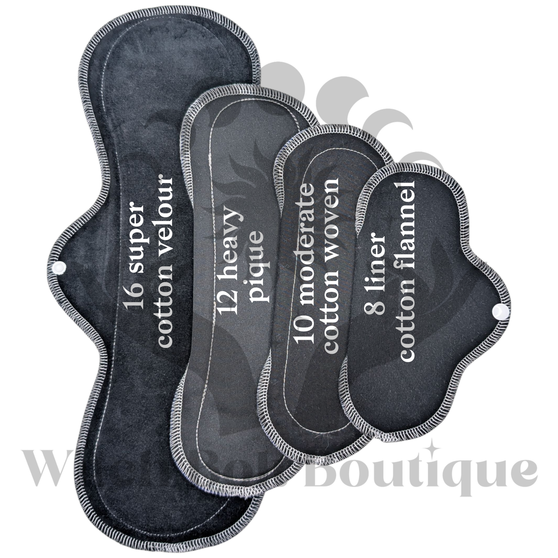 Curious about cloth pads but overwhelmed by choices? This starter kit takes the guesswork out of the equation! Explore 4 different lengths, absorbency levels, and fabric options to discover what feels right for you. Plus, you'll get an interlabial pad and protective wrapper to round out your collection. Six premium items worth $76, bundled at an unbeatable price to launch your sustainable cycle journey. New to us? Snag an extra discount on top of our already-discounted bundle price. (code: COVEN at checkout) Your perfect pad match is waiting!