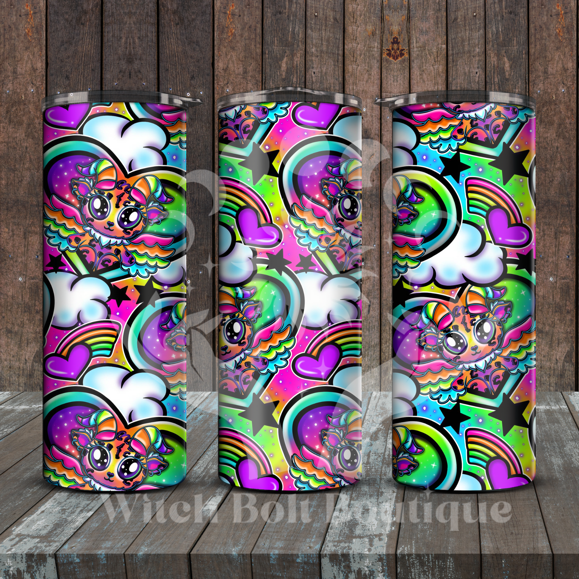 Experience the ultimate 90s nostalgia with our double-walled stainless steel 90s Baphomet Tumbler! Keep your drinks hot or cold for hours with our slide closed lid and straw included. Adorned with a fun little Baphomet, this tumbler features a bold neon design that is sure to make a statement. Stay cool and trendy while staying hydrated!