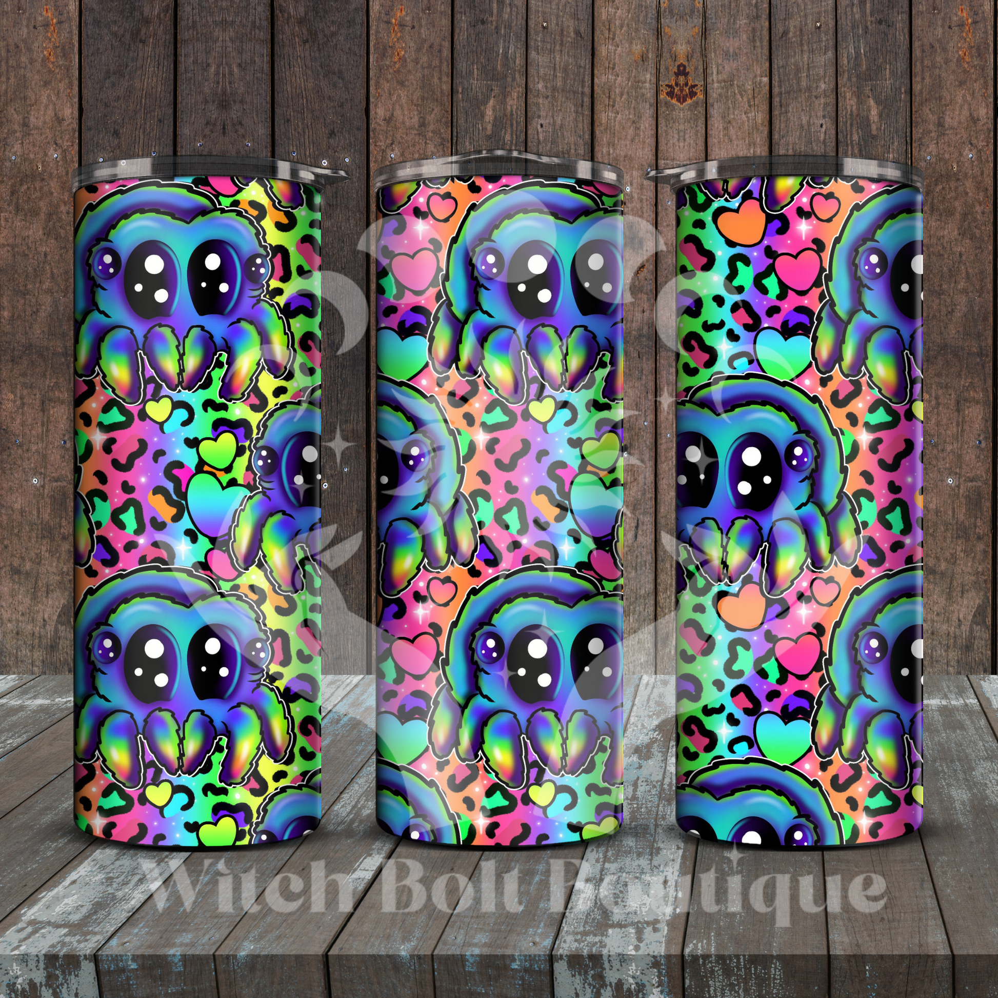 Experience the ultimate 90s nostalgia with our double-walled stainless steel 90s Spider Tumbler! Keep your drinks hot or cold for hours with our slide closed lid and straw included. Adorned with a fun little spider critter, this tumbler features a bold neon design that is sure to make a statement. Stay cool and trendy while staying hydrated!