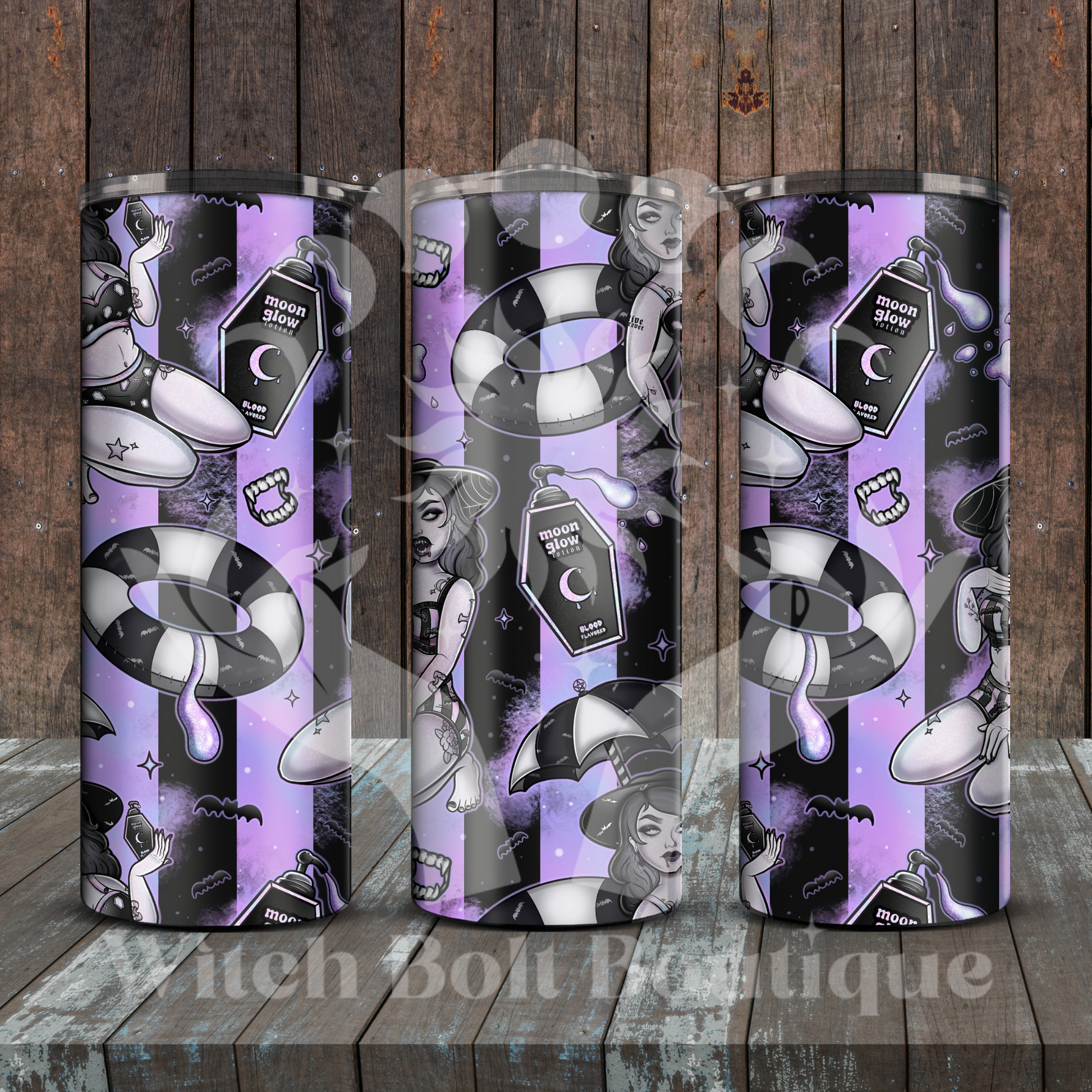 Indulge in the spooky summer vibes with our Beach Vampire Tumbler! Featuring a sultry vampire pinup on a moonlit beach, this double-walled stainless steel tumbler keeps your drinks hot or cold for hours. Perfect for moon bathing or beach days, it comes with a straw and slide closed lid for convenience. Embrace the darkness in style!