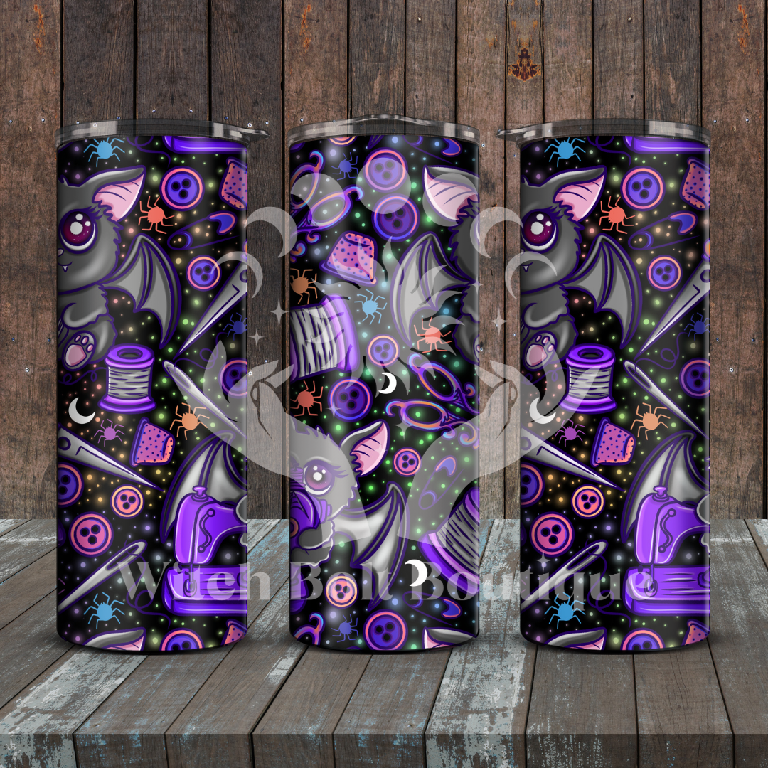 Stay hydrated in style and show off your spooky side with our Crafting Bat Tumbler! Our double walled stainless steel design keeps your drinks hot or cold for hours, while the slide-closed lid and straw make sipping easy. With bold colors and a love for spooky hobbies, this tumbler is a must-have for any passionate sewist.