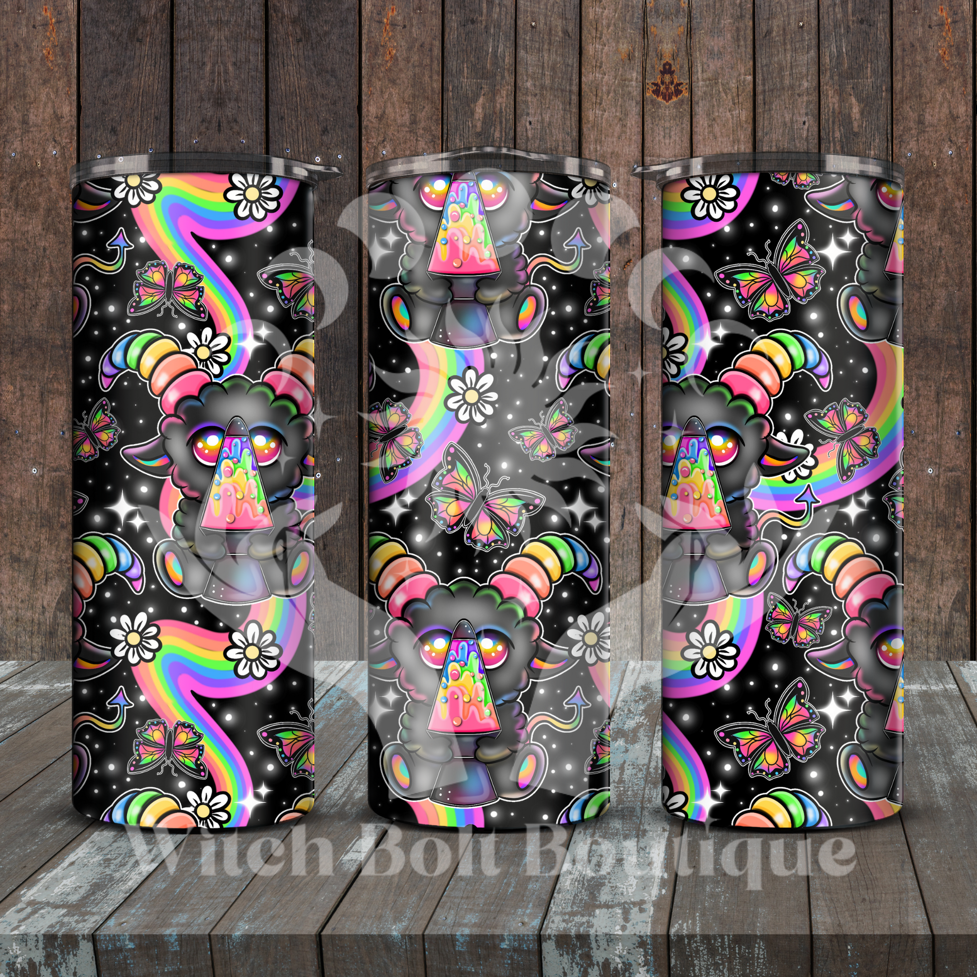 Indulge in the colors of the rainbow with our Rainbow Baph Tumbler from the Chromatic Coven Collection. This stylish tumbler boasts a double-walled stainless steel design, keeping your drinks hot or cold for hours. The slide closed lid and included straw make it perfect for on-the-go sipping. Add a pop of color to your day while showing off your love for the mystical with our baphomet design.