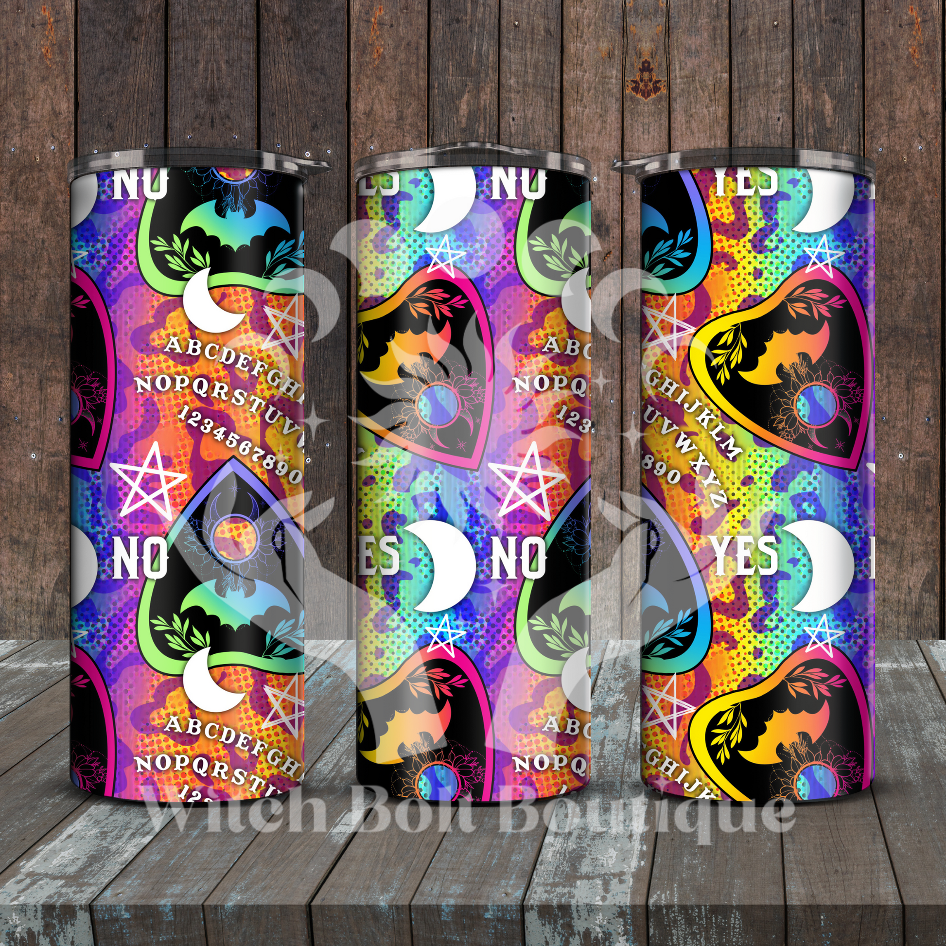 Indulge in the colors of the rainbow with our Rainbow Planchettes Tumbler from the Chromatic Coven Collection. This stylish tumbler boasts a double-walled stainless steel design, keeping your drinks hot or cold for hours. The slide closed lid and included straw make it perfect for on-the-go sipping. Add a pop of color to your day while showing off your love for the mystical with our planchette design.