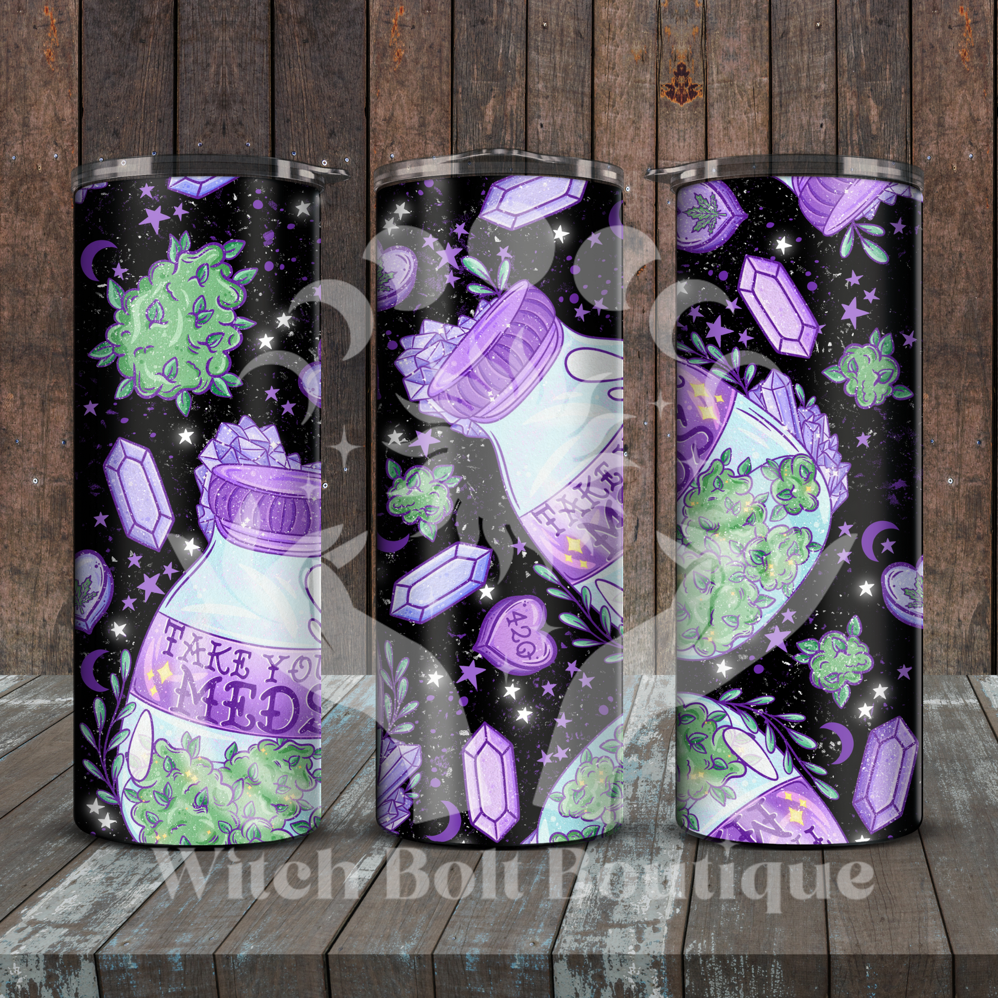 Experience the ultimate collection of 420 designs with our Elevated Collection: Take Your Meds Tumbler. With bright bold colors and double wall insulation, this tumbler keeps your drinks hot or cold while also making a statement. Complete with a convenient straw and slide-close lid, you'll never want to leave without it!